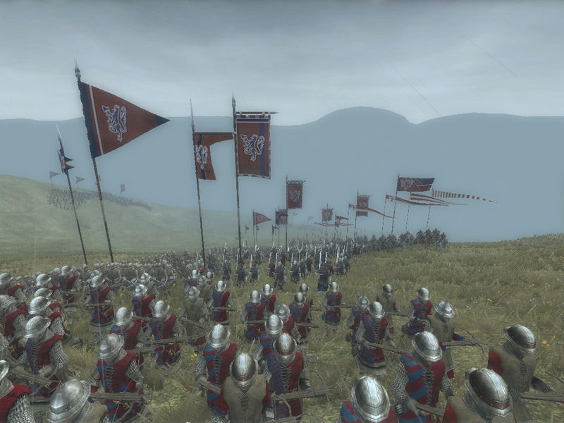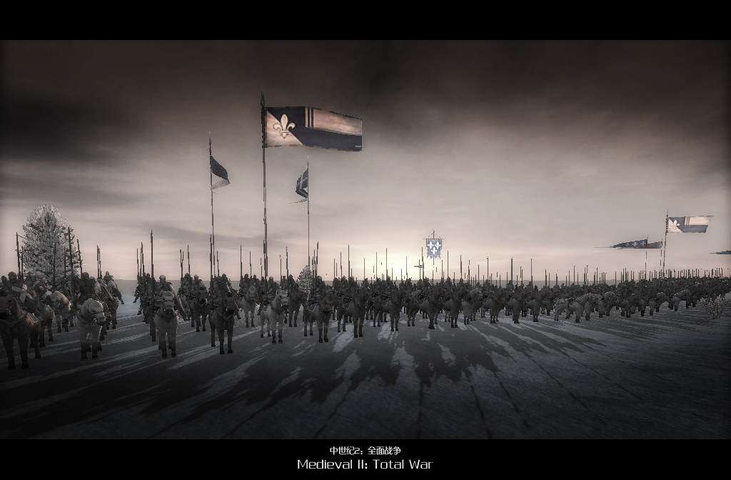 西西里王国的重装步兵(具体啥名字忘了。。) 远处的旗帜上有西西里王国的三条腿徽章 嘿嘿 大家可以发现这张图变成了雪地 没错 在游戏的战略地图上 是按照回合制进行游戏的 这个回合是夏季 下个回合就是冬季 然后来回往复 不同的天气环境 对战斗的胜负也有重要影响