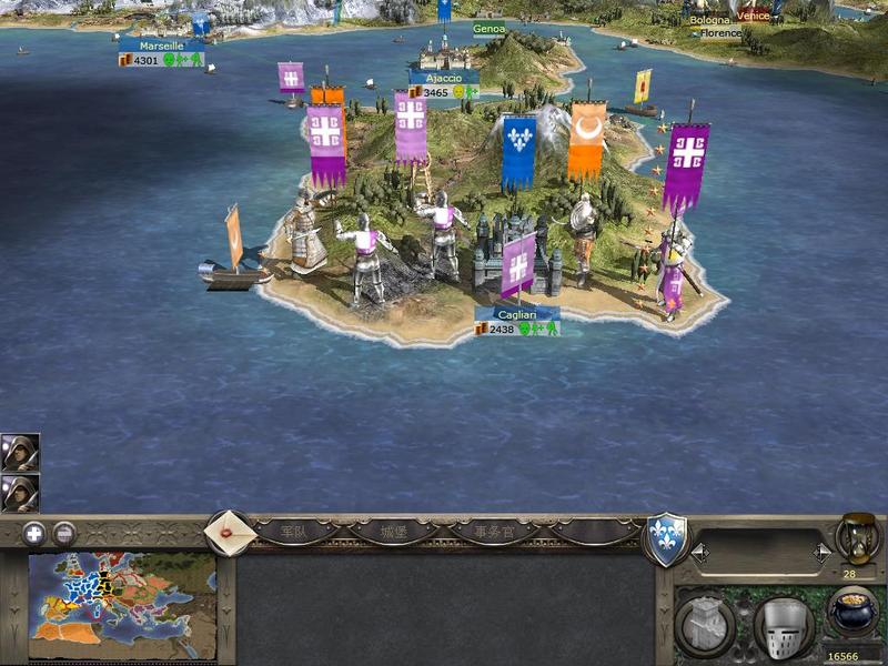 中2里 海战只能自动作战 没法亲自指挥战斗 但海军在远距离运输部队 封锁敌人港口 截击敌人海上运输部队的舰队时 有着十分重要的作用 这里是撒丁岛 岛上云集了法兰西 摩尔以及拜占庭三国的军队 而争夺的目标就是那个城堡 中2里的据点分为两种 一种是城镇(城市) 一种是城堡 前者有着较高的税收 后者则能快速的出高级兵种 当然 前提是你得有钱去升级建筑和科技