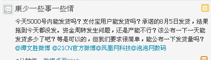 今天5000号内能发货吗?支付宝用户能发货吗?承诺的8月5日发货,结果拖到今天都没发。资金周转发生问题,还是产能不行?该公布一下一天能发货多少了吧?等是可以的,但我们要求很简单,能公布一下发货量吗?@谭文胜微博 @21CN官方微博@凤凰网科技@泡泡网数码
