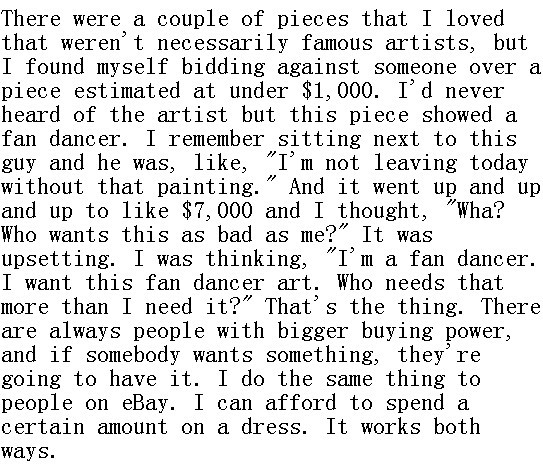 "Generally," says Von Teese, "I have a big appreciation for the way things were made with a different kind of beauty, pre-1940s. And generally, I don't care what the value is. Somebody once told me, 'Do you know what you have there?' And that's great. I'm glad to know something I have has a certain kind of resale value. But generally, I'm not a snob about my collection. I buy things that I like."