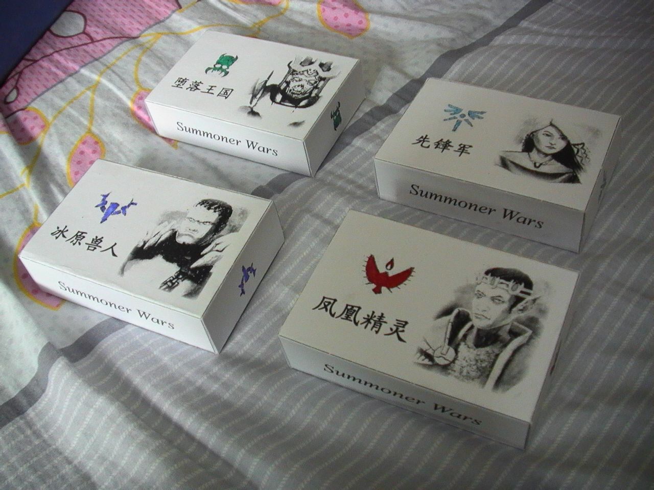 每个种族牌盒的正反面,盒子是自己设计的,图像文字也是自己弄得,纸用的是4毛一张的厚纸(感觉被坑了),我打印全是黑白打印,如果有彩色全是水彩笔画的····