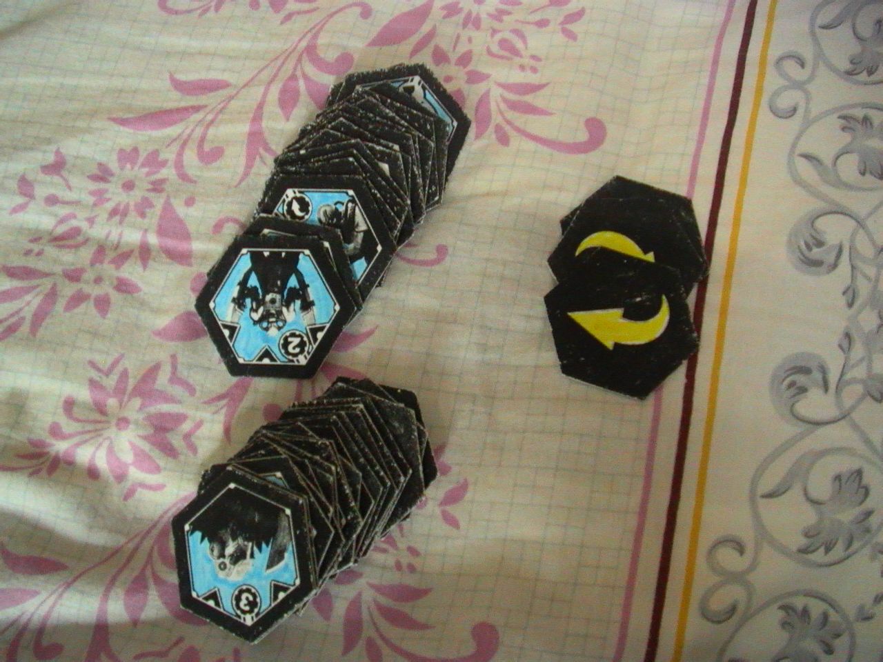 骰子跟token,骰子12块一百个买的,token是打印后三层厚纸打印后黏在一起再上色,最后剪下来,效果还不错~~