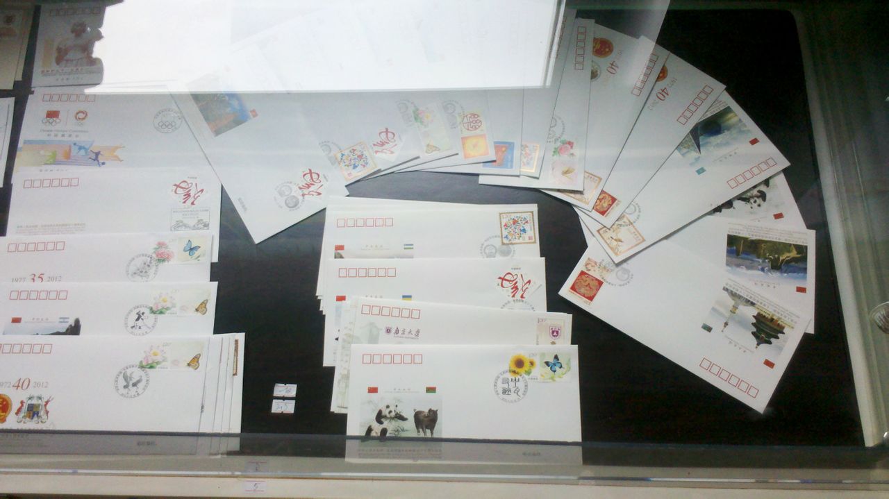 下面是邮局里拍到的柜台,好多的纪念封,首日封啊,单枚的封基本是2.5或3.5元。福禄寿喜首日封一套9元。上班族的悲哀啊,平时在家都看不到那么多的封。
