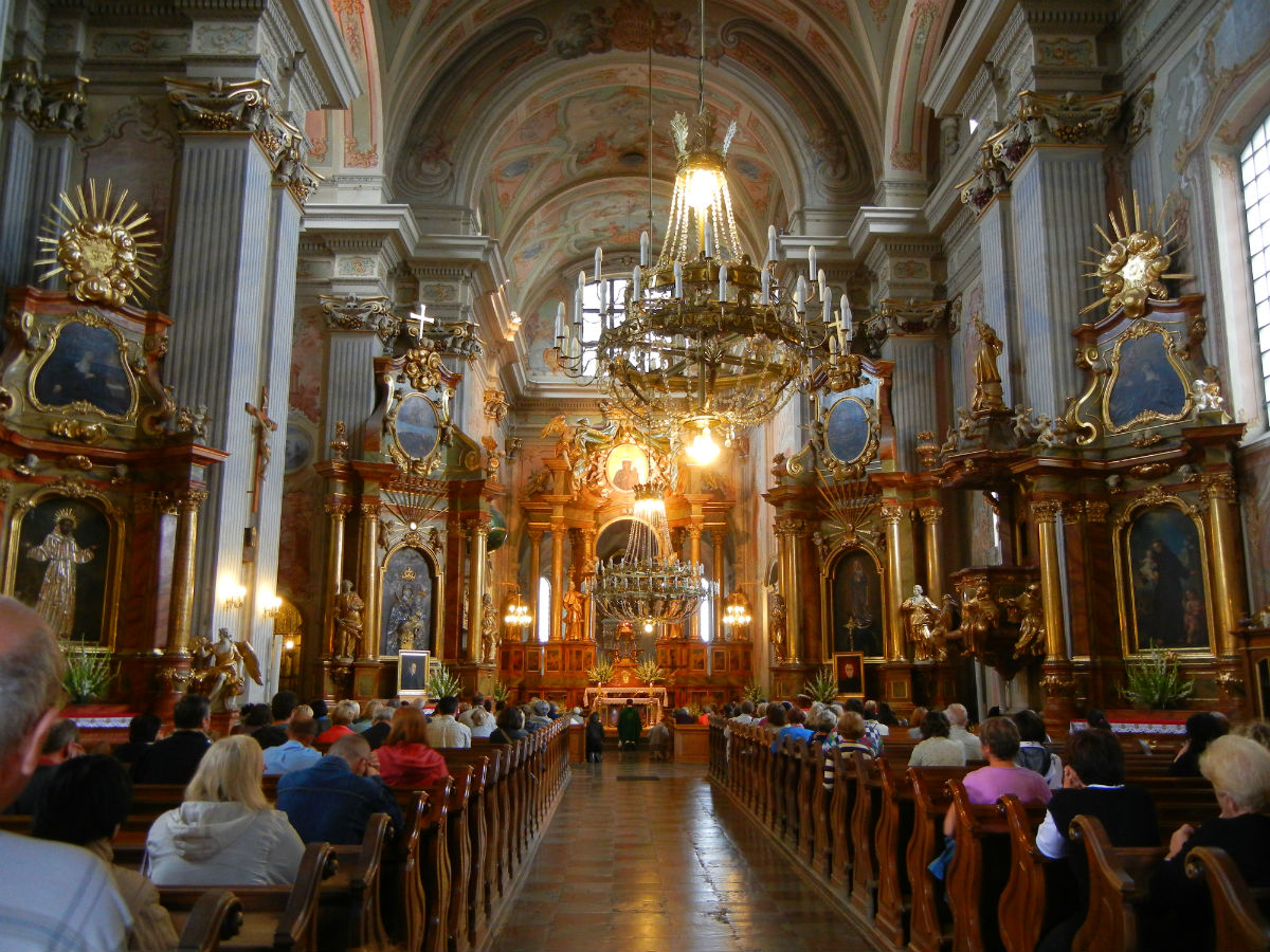 波兰是天主教比较盛行的国家,而且我每次进一个教堂参观的时候,里面都有仪式,不是婴儿受洗,就是新人成婚,或是例行的弥撒等等。可见波兰人对宗教还是有很高的认同感。这是一个在古城区中心的大教堂,内部非常华丽。正如后两张照片所示,里面坐满了人。