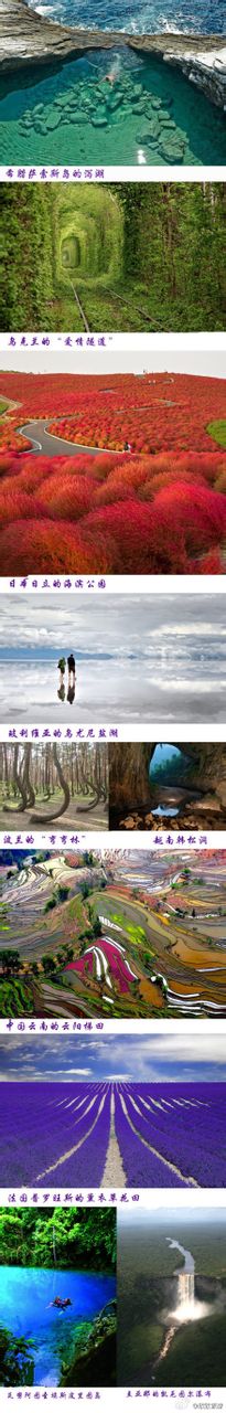 十大人迹罕至美景,摄影必去地——1.希腊萨索斯岛的泻湖;2.乌克兰的“爱情隧道”;3.日本日立的海滨公园;4.玻利维亚的乌尤尼盐湖;5.波兰的“弯弯林”;6.越南韩松洞;7.中国云南元阳梯田;8.法国普罗旺斯的薰衣草花田;9.瓦努阿图圣埃斯皮里图岛;10.圭亚那的凯厄图尔瀑布。
