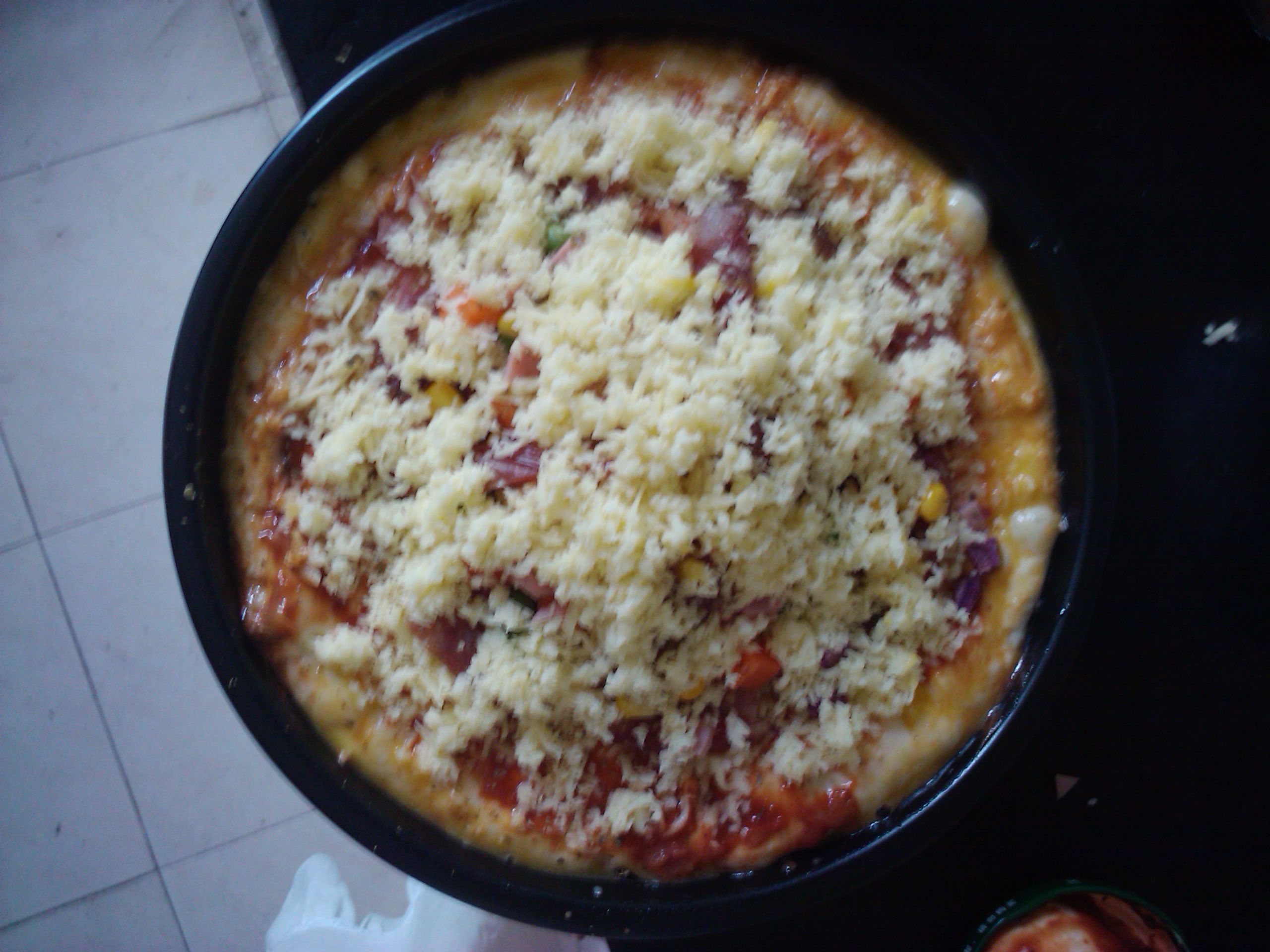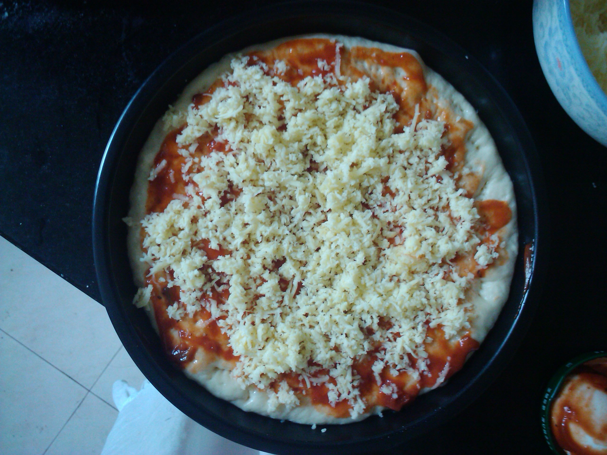 我是做两个八寸的,饼底料:高精面粉200g,干酵母2g,盐2g,糖10g,水120g,黄油10g,奶粉5g(这个可以不放)。步骤:1:先把水和酵母混合;2:把面粉过筛(晒过的面粉比较均匀,不会有结块的现象),然后和糖、盐、奶粉混合均匀;3:把酵母水倒入面粉中,开始和面;4:等面粉开始出精了,加入黄油,再继续和面,直至表面光滑,手上和面板上都很干净(为了更快让面变精,可以在面板上摔打面团);4:(盖上保鲜膜)发酵面团至2倍大(夏天大概一个到一个半小时),把面分成两块,揉成圆的,盖上保鲜膜继续发酵15分钟(这是为了面松弛),然后把面擀成披萨盘那么大;5:在盘底刷上一层橄榄油,然后把面饼放进去,整一下形(边缘厚,中间薄),再盖上保鲜膜,继续发酵30—40分钟;6:用牙签或者叉子在面饼上均匀地插上孔(防止烤时面里空气膨胀涨破面皮),在刷上披萨酱(我都是用番茄沙司代替,不是番茄酱的),在撒上芝士(披萨专用的,马苏里拉奶酪,好像它还有别的叫法,什么莫扎里之类的),再放上自己喜欢的菜(最好不要放容易出水或水分很多的菜,或者这些菜事先热过),在撒点披萨草、黑胡椒(这个没有也行,撒上味道更好而已),最后撒上一层芝士(一个8寸我一般用100g左右的芝士);7:放在烤箱中用180度烤20分钟(由于的我的烤箱有披萨模式,所以调到那个模式就好了。温度和时间要根据每个人的烤箱做相应的变化,多试验几次就知道了);完结,打的手好累