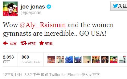 8月10日在英国接受US Weekly的采访时 Aly Raisman表示对于Joe在Twitter上对她的称赞受宠若惊 并表示有机会想要认识Joe:"I would go on a date with him."