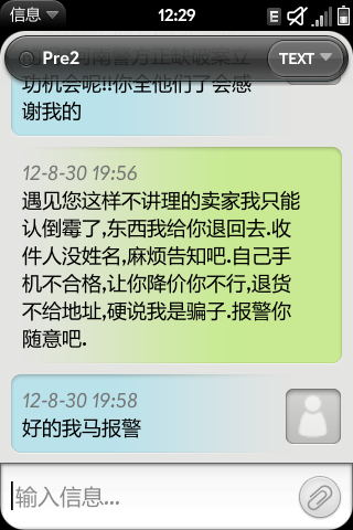 这是卖家不满意买家对手机成色进行质疑并进行人身攻击的截图,从其中对话来看卖家准备强卖强买