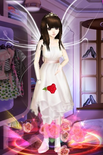 套装:迷雾白鸟,发型:深褐迷恋,鞋子:素白谜殇,美容:糯米饭团,翅膀:云端精灵之翼,手持:红色玫瑰。