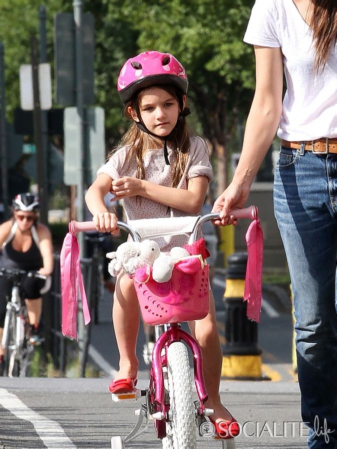 Katie Holmes gives her daughter Suri some direction while teaching her how to ride a bicycle on the bike path of the West Side Highway on Saturday (August 18) in New York City.