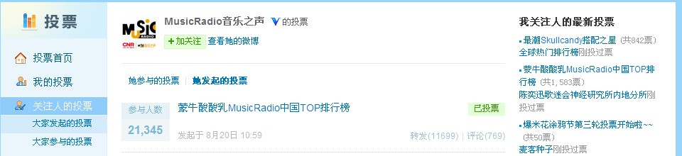 投票方法:登陆新浪微博-进入投票主页,查找“MusicRadio音乐之声”发起的投票,进入第一个投票项投票即可