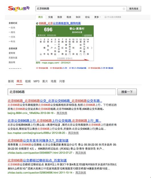 360搜索太难用,我查去香山的696路最晚是几点,Y根本没结果。搜狗则一目了然。