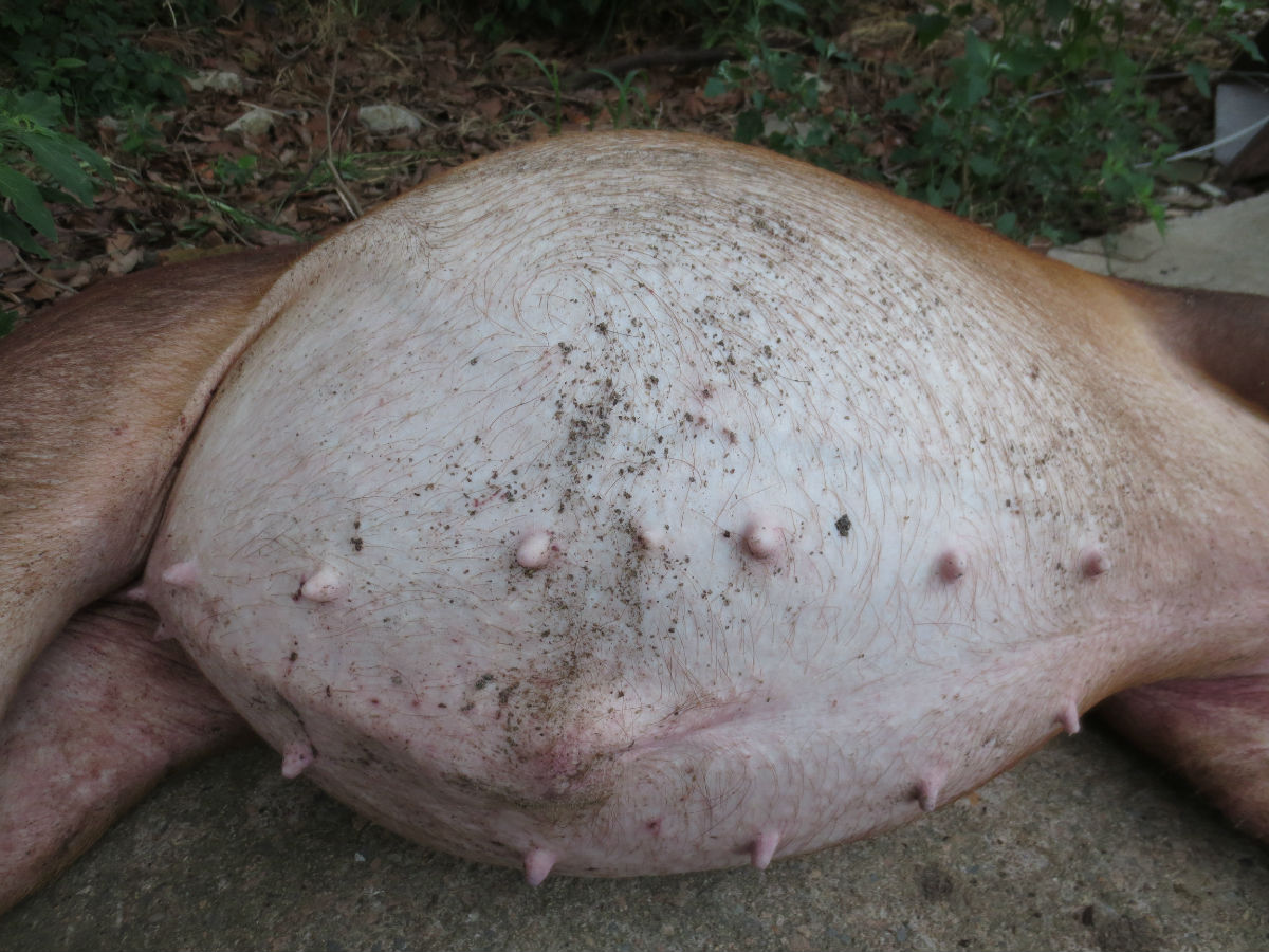 今下午才发现的,一头育肥猪80斤左右,,胀气,,先用针头扎肚子放气,,没起到效果,,后用食用油灌进嘴里,灌了将近300多毫升,,就吃饭去了,,回了之后,发现猪已经死亡,,成了气球,,不多说了,上图
