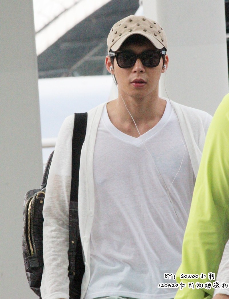 @SoWoo小羽:【120824仁川机场及浦东机场关内】有天心情不错~安检排队时站在有天旁边,不敢看他,鼓起勇气偷看两眼,结果对视了..好紧张!>_< 在仁川机场闲逛了20分钟左右,一路说说笑笑,之后进休息室,出来时我们就站门边,有天从面前走过时咧嘴一笑(喂~笑神马).到上海走了其他通道.