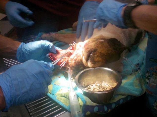 可怜的牛头犬贝拉,仅脸部就被扎了500多根豪猪刺,变得人不像人,NO,应该说是狗不像狗。她的主人在搏斗结束后,马上托起贝拉,将她送至当地的一家动物医院进行急救治疗。