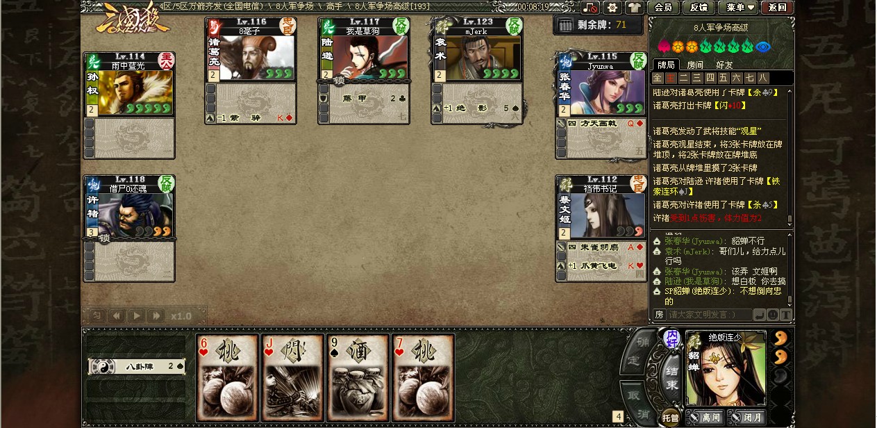 春哥的回合 拿走了术爸的方天 之后扔出了桃园 毒菜的一血却被许褚的无邪搅黄了 断杀的春哥只好酱油了