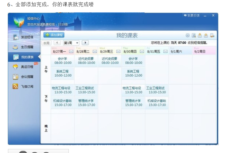 飞信会每天给你发信息,告诉你都上什么课,在哪里上。而且会根据周数,自动添加减去相关课程
