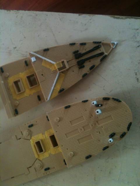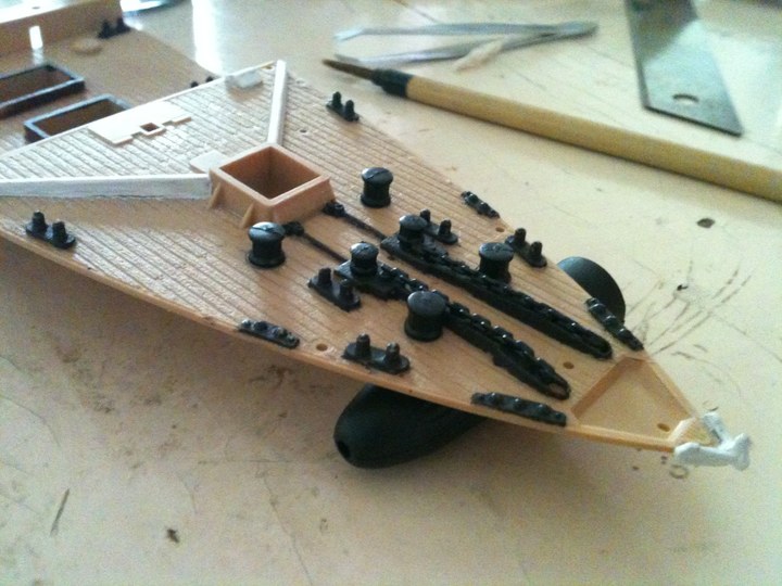 手上漆有田宫的铁黑,涂揽桩用,田宫棕色,涂梯子用,另外后买的仙盈的消光白,用来涂船体白色。