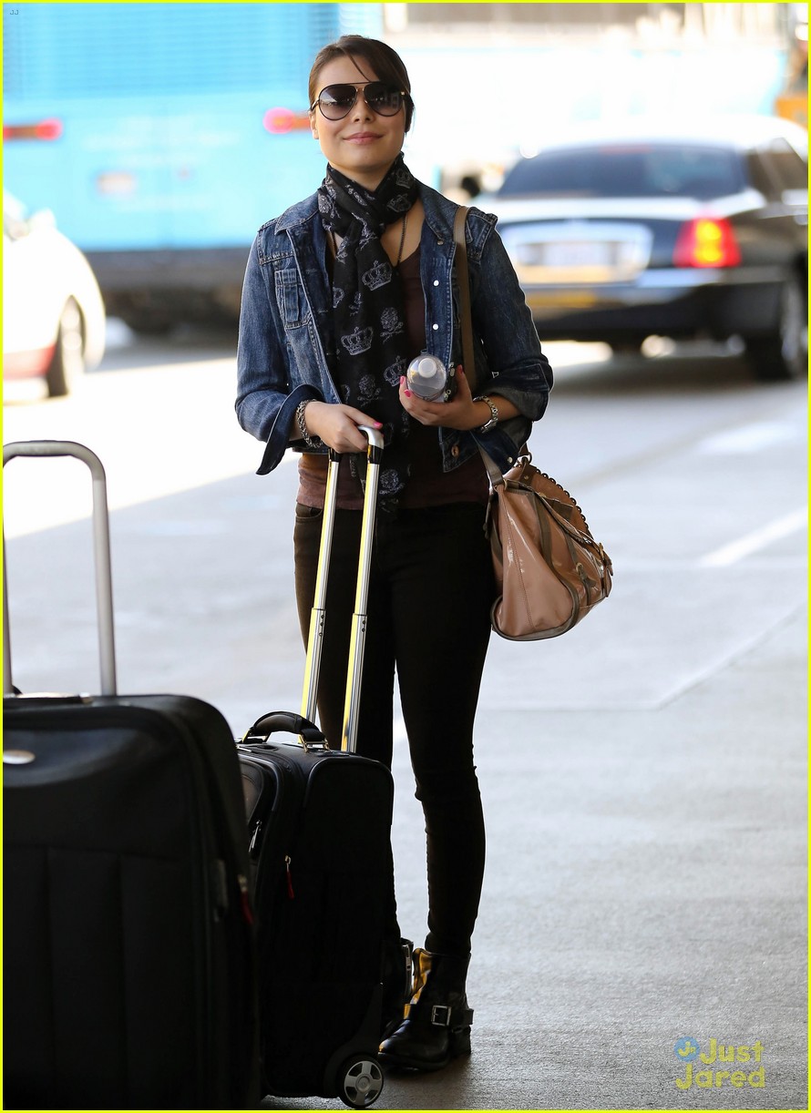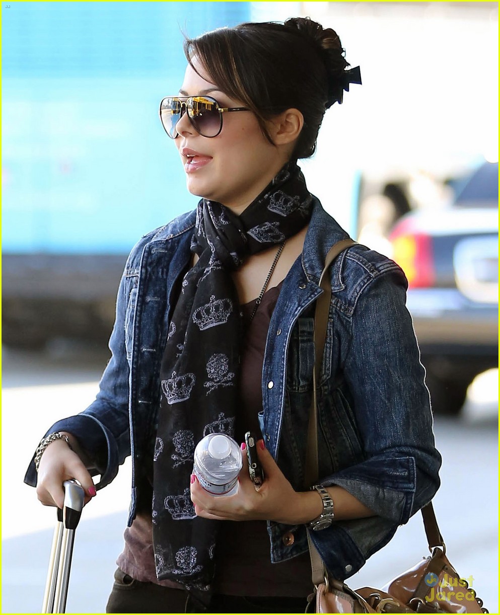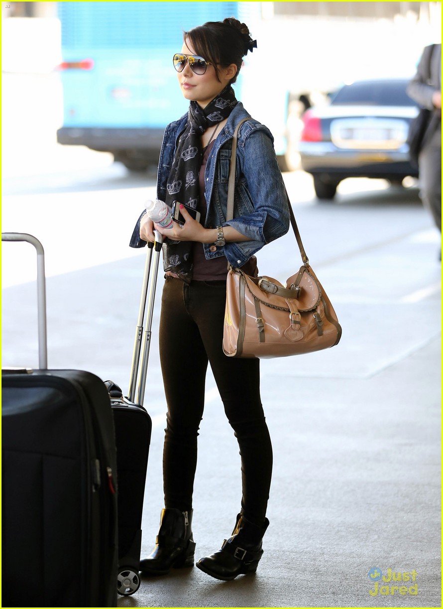 Miranda Cosgrove is comfy chic in a jean jacket and crown-printed scarf as she arrives at LAX Airport on Wednesday (August 29) in Los Angeles.