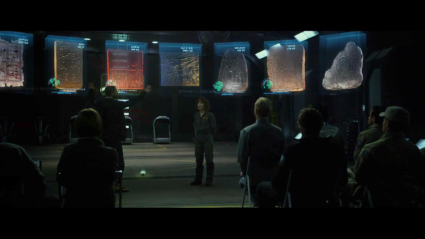 解释完了“普罗米修斯”造人的经历,下面的情节就是大家喜闻乐见的盗火了。“火”代表人类文明,而片中的“工程师”难道只是创造了生物意义上的人类之后就撒手不管了吗?从电影的细节来看,不是这样的。第一个线索是主人公发现了众多的考古学证据证明“工程师”的存在,这点可以证明他们在人类诞生并有了原始文明后继续充当了一段时间的“教导者“,以古人崇拜的”神“和造物主身份接受膜拜并给予启示(后面我会对几块古文明碑文齤做详细解释)。而在电影情节中,显示”工程师“与古代文明关系的,绝大多数与人造人大卫有关系。