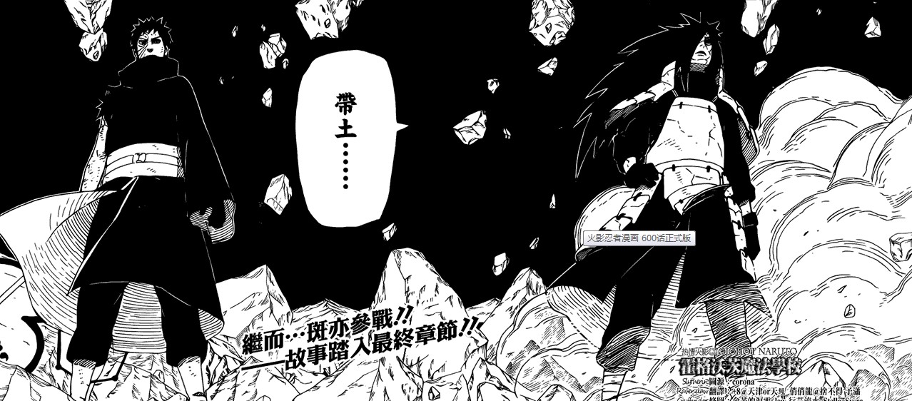 话说火影也快完结了,600话最后写的,斑亦参战,故事进入最终章节。剩下的战斗力还有五影,兜,佐助,卡卡西,凯,8尾9尾,斑,带土。最后会是谁解决了斑呢?我猜是兜