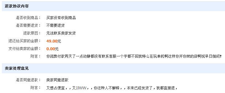 这特么客服没理我 我就去申请退款了 退钱的时候终于特么活了 我都没好意思说脏话 这卖家倒开始BB了 我QNMLGB
