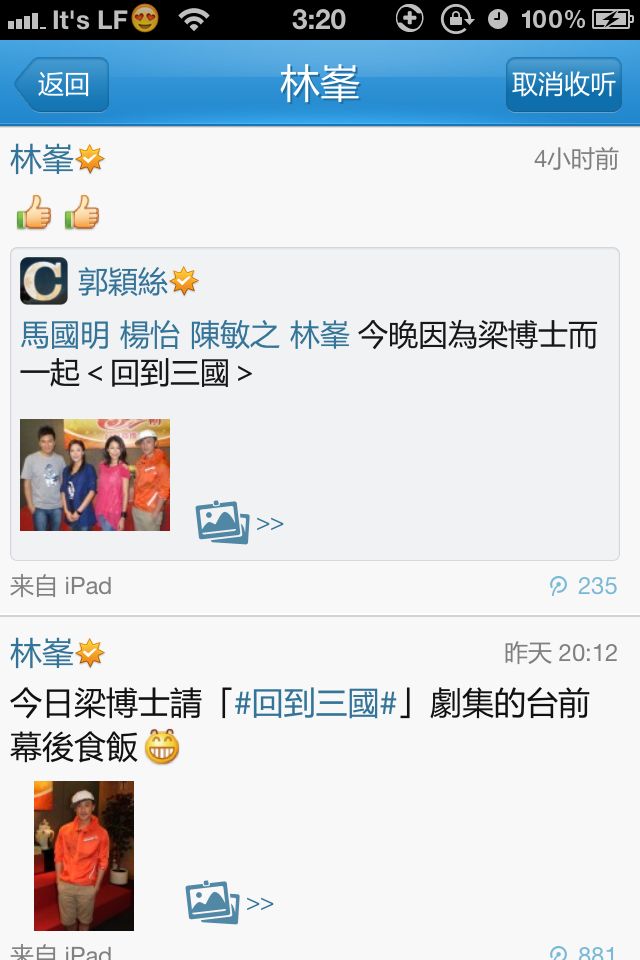 刚刚无聊看渣头腾讯微博,今晚的居然是ipad转发啊,以前都是tvb.com,这次是ipad,不会是渣头自己发的吧,我凌乱了…