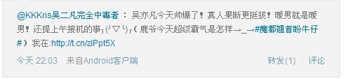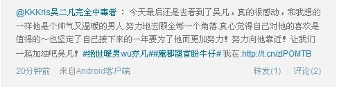 @KKKris吴二凡完全中毒者 : 今天最后还是去看到了吴凡,真的很感动,和我想的一样他是个帅气又温暖的男人.努力地去顾全每一个角落.真心觉得自己对他的喜欢是值得的~也坚定了自己接下来的一年要为了他而更加努力!努力向他靠近!让我们一起加油吧吴凡!