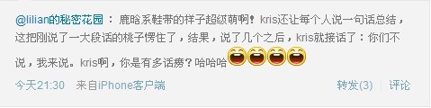 @lilian的秘密花园 : 唱MAMA还是你的世界的时候,kris飞吻一个,成员说话的时候,鹿晗不停飞吻,还教xiumin一起,kris自然也是频频飞吻,身边的张艺兴貌似又JPG了,kris直接上手了,把手放到张艺兴嘴前,然后甩向观众,哈哈哈,艺兴啊!!!