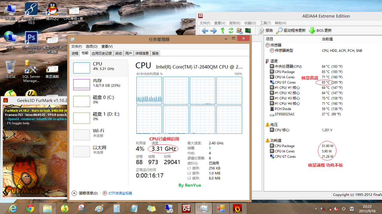 因为手头并没有好的单核心计算软件 于是自己写了个使CPU单核双线程满载的程序 多核满载使用的AIDA64自带系统稳定性测试 显卡满载使用的FurMark 1.10.2