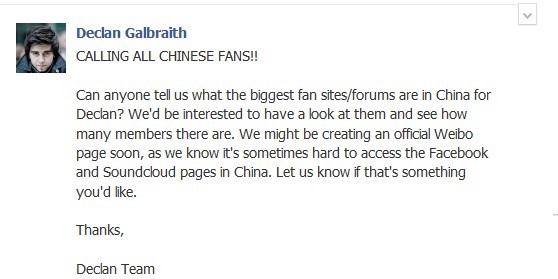 能有人告诉我们Declan在中国最大的网站或论坛吗?我们想看一下(有什么好看的。。看得懂吗你们),看看那里有多少成员。我们可能会马上开一个官方微博(weibo是中国的!!!),我们知道在中国很难上FB和SC(知道就好)。如果你们喜欢,请让我们知道。