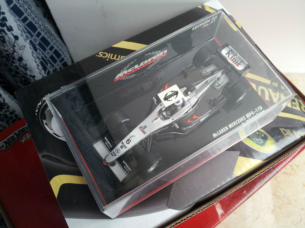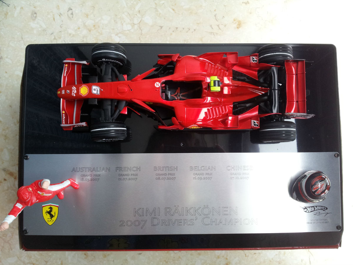 法家没说的,肯定是冠军车F2007,也是最贵的一辆,说实话,偶不喜欢这家车队,不是因为Kimi离开法家,而是在他去之前偶就不喜欢了,各种原因,最大的就是太政治。不过谁叫他在那拿冠军了呢,所以败了一辆,至于现在的Lotus,至今只看到以Kimi复出为名的车型,并不是现在开的E20,所以等以后再看成绩和车型,应该也会败一辆,最后是头盔,说句真心话,KR的周边很难淘,所以头盔及时入手偶觉得还是很值的。