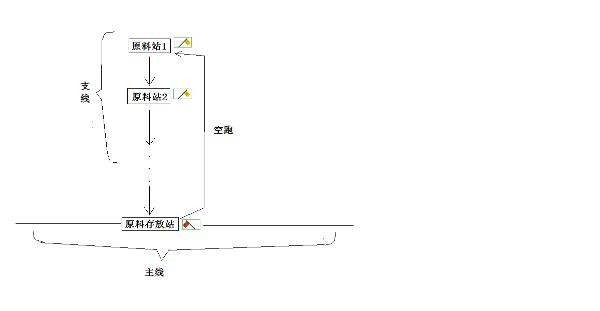 1、2两站分别供给铁和煤,用黄旗将他们收集;运到3站,3站是钢铁厂加工站,用红旗卸货;再将钢运至模具厂,同样用红旗卸货;最后的需求站使用默认黄绿旗销售。