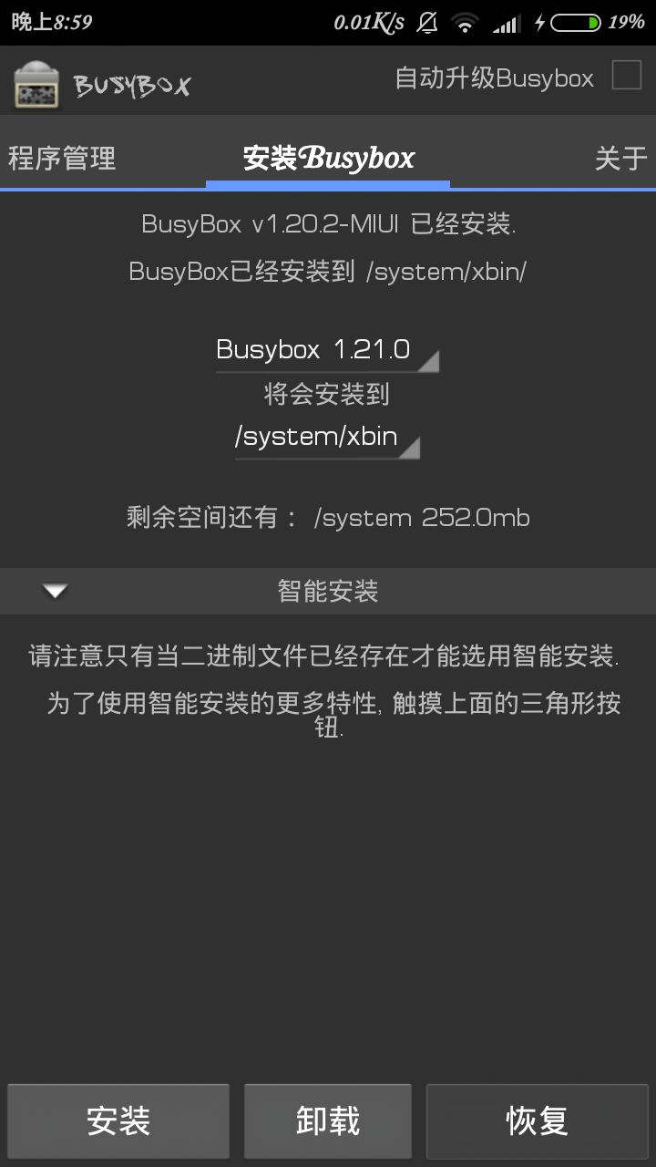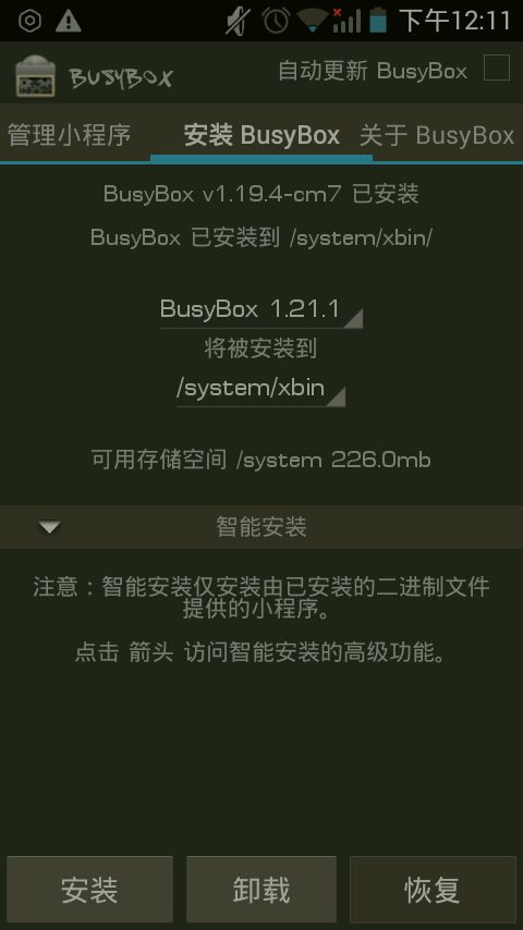 7装上有什么好处?装上后很多系统类软件需要它的支持,虽然软件完全可以内置bin。我测过,很多软件运行首先搜索系统是否内置busybox,如内置,使用系统的。如不内置,使用自带的。这只能说明:系统内置的busybox更稳定。。。