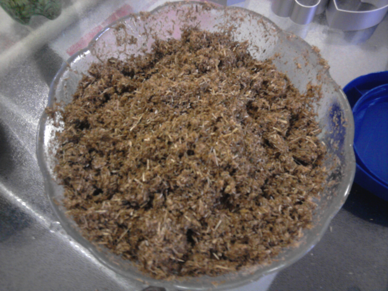 首先把碎草打成草粉,先放满杯的碎草