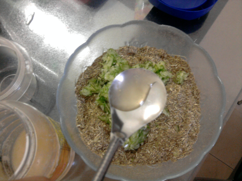 今天终于赶上还算好的天气,做了草饼乐滋滋,拍点照片美滋滋,先说原料吧。碎草必须的,爱宝粮,玉米片,燕麦片,黄瓜半根,蜂蜜一点点点点。