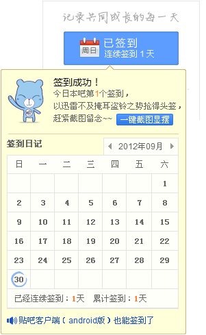 连续在本吧签到1天,晒下签到排名照,看看我神马水平