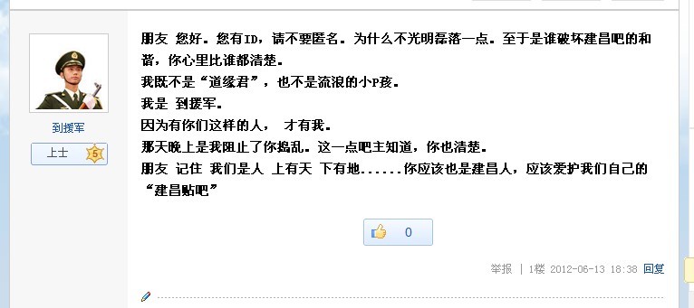@到援军 我只想说一句。。 下次骂人 说话 整明白的行补?