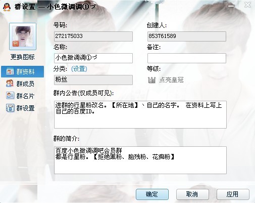 1群是@雅望天堂灬 77建立的会员群,群号为272175033 群昵称是小色微调调①づ进群的饭饭要记得改名哦。格式:【所在地】丶自己的名字。 还要记得在群资料上写上自己的百度ID。