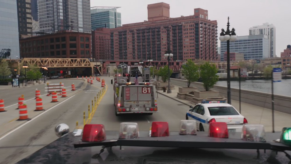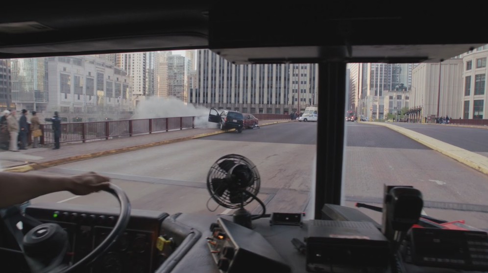 为了拍摄这一跨度很大的场景,直升飞机需要飞过芝加哥的河流,并俯视Wacker Drive——整个拍摄距离大约有500米。摄制组使用了500 帧/ 秒、5.6k 分辨率的IMAX巨幅胶片拍摄,驾驶直升机俯拍成千上万市民离开哥谭市的场景,从芝加哥河到Wacker 大道,其中大概使用了500 个临时演员。Double Negative通过数字化去掉不需要的交通和行人,设计师配合直升飞机镜头,在特定的地点使用专门的工具画上路线,然后从库里调用大量3D制作的人来加到路线上,在镜头里填充大约了50000 人和10000 辆车。