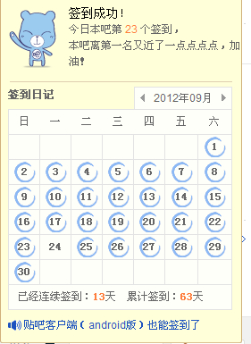 签到的事儿咱就甭提了成不。我每天5点多刚一睁眼还在朦胧状态,摸出手机上贴吧就签到,那叫一个悲催啊。估摸着我还不第一个签么。结果白天电脑上一看“您是第4个签到”……擦!来火!