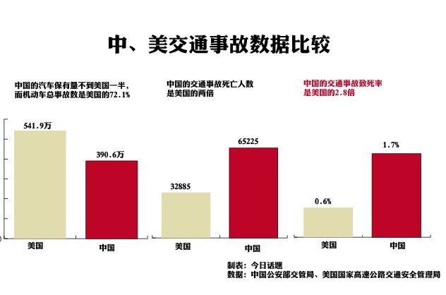 由于美国2011年的交通事故详细数据还未出版,只能将2010年的数据用作比较。2010年美国发生交通事故514.9万起,中国为390.6万起。考虑到中国的汽车保有量是美国一半不到,这个事故率已经很惊人。
