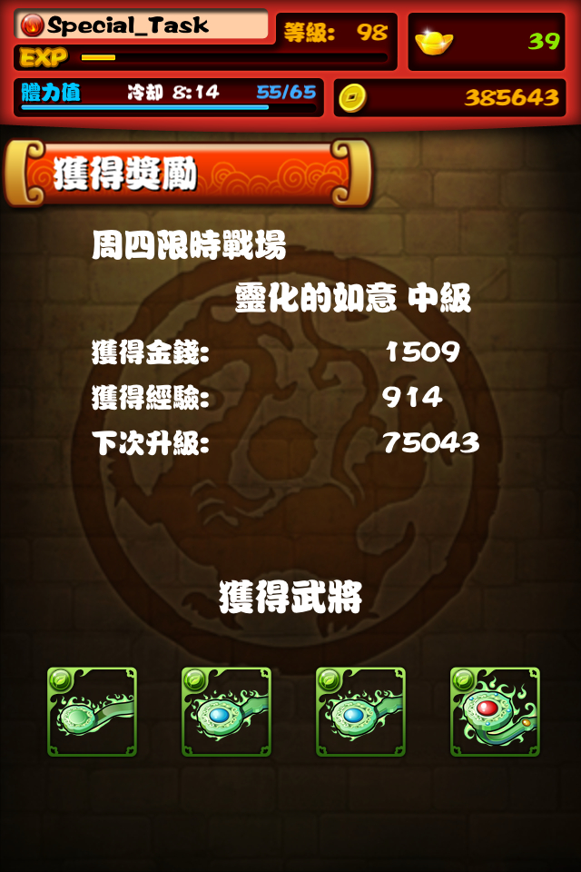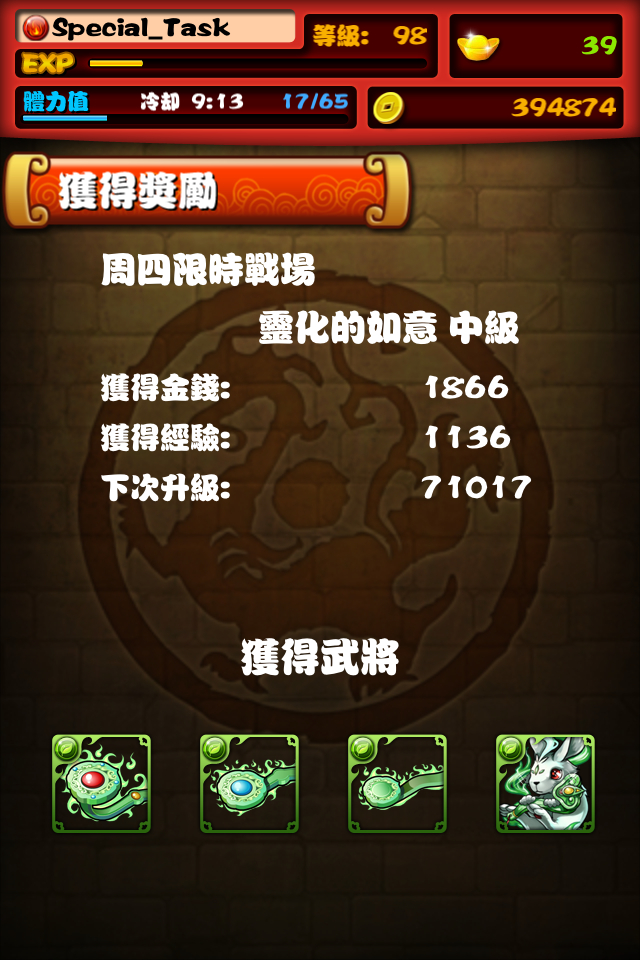 因为法正和甲鱼需要转五星,所以刷了两管体力的如意。实测如下,第一管体力六把,未出玉兔。第二管体力前三把没有兔子,果断关游戏重新进入,后两把出了一个。