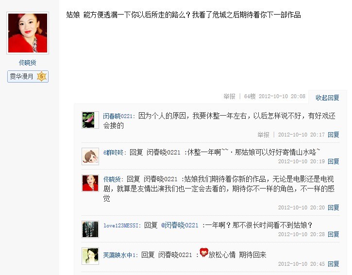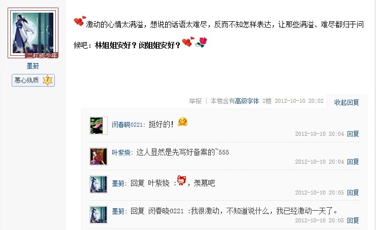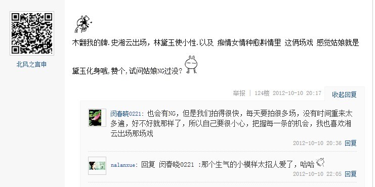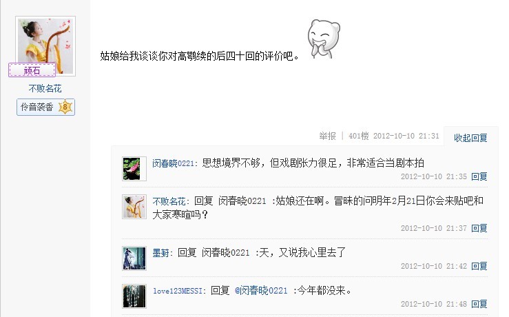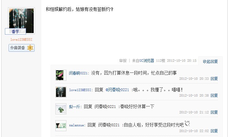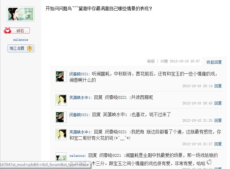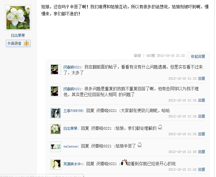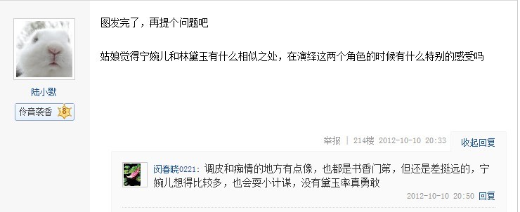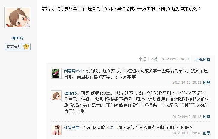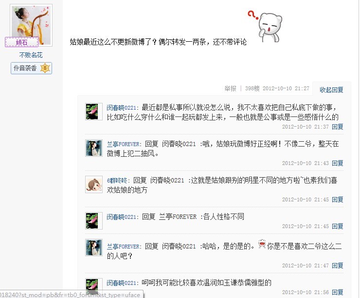 2012年10月10日星期三晚20:02分,姑娘准时做客贴吧与粉丝互动
