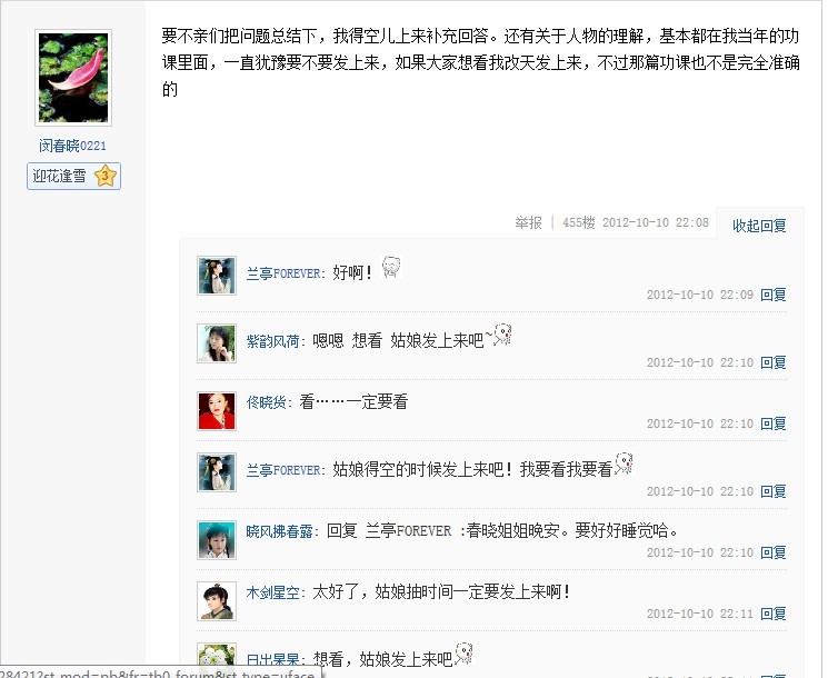 截止春晓最后一次发帖,共455贴,春晓发布、回复帖子69条。回复率15.164%