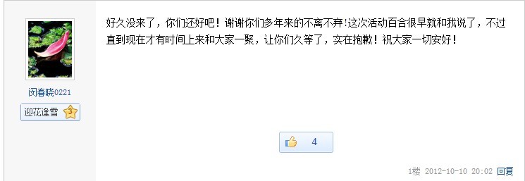 “好久没来了,你们还好吧!谢谢你们多年来的不离不弃!这次活动百合很早就和我说了,不过直到现在才有时间上来和大家一聚,让你们久等了,实在抱歉!祝大家一切安好!”