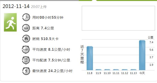 纪念自己第一个慢跑达到一小时,感觉自己跑的太慢了。今天跑步比较注意姿势,没有前几天跑步后膝盖那么难受了。哎!跑步也是技术活啊。