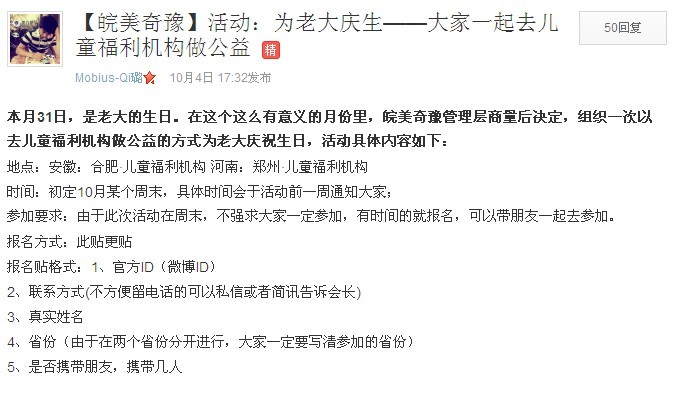 本月31日,是老大的生日。在这个这么有意义的月份里,皖美奇豫管理层商量后决定,组织一次以去儿童福利机构做公益的方式为老大庆祝生日,活动具体内容如下: 地点:安徽:合肥·儿童福利机构 河南:郑州·儿童福利机构时间:初定10月某个周末,具体时间会于活动前一周通知大家;参加要求:由于此次活动在周末,不强求大家一定参加,有时间的就报名,可以带朋友一起去参加。报名方式:此贴更贴 报名贴格式:1、官方ID(微博ID) 2、联系方式(不方便留电话的可以VB私信或者简讯告诉会长) 3、真实姓名 4、省份(由于在两个省份分开进行,大家一定要写清参加的省份) 5、是否携带朋友,携带几人