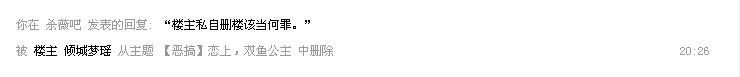 百度新上线,楼主可删除自己贴中回复的技能,这种功能是为了方便楼主删除自己贴中的有关H等垃圾楼。但是倾城梦瑶却用这种功能随便删除吧亲在贴里的回复,吧务组按照吧规,做出封号拉黑处理。