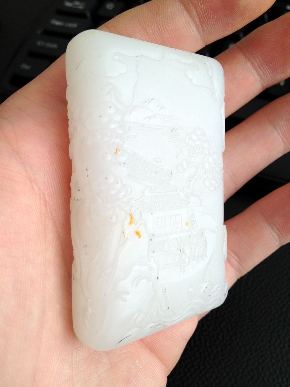 说实话这个雕工没有雕出它的价值来,屋脊玉飞檐间的过渡不对,屋面的基本的透视关系都有问题,山石的形态也欠美观!如果你的料子是真是和田籽料的话,那就给这工给害了!